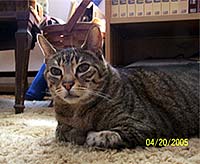 Story: Poey’s lymphoma was diagnosed on April 26, 2005 with a mass, which was a lymph node pressing against his colon. He was also having constipation. He was diagnosed by ultrasound and needle biopsy. Poey’s treatment is from the University of Wisconsin, Madison Chemotherapy protocol for cats with lymphoma, although Poey does not take the prednisone, since he is diabetic. This is a 25-week therapy using Vincristine, L-asparaginase (one-time only), cyclophosphamide, doxorubicin, alternated weekly. After week 9 he will have chemo every other week until the 25th week. Poey is responding really well to the chemo drugs with no weight loss, good appetite, good spirits, looks good. His glucose numbers have been kind of all over the place but the Dr. said it was to be expected, and we are increasing and decreasing insulin accordingly for now.