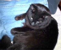 Story: Majestic handsome black cat became a finicky eater & rapidly lost about half his body weight. Vet thought kidney failure as Sable had no vomiting or diarrhea (pretty common I found out later!) Ultrasound: negative kidneys, liver, spleen, + bowel lesion, emlarged nearby lymph nodes. Surgery removed lesion & biopsied some nodes (nodes came back reactive only, not malignant; bowel lesion + for lymphoma) Healing now, bowels working, being syringe-fed in addition to favorite foods. Special AD diet, Fancy Feast & Ensure mixed looks vile but he gets it down & nibbles on Fancy Feast between times.