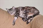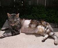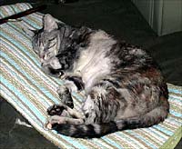 Story: Zoe Belle was diagnosed April 6 2005, almost 5 years old (DOB 7/1/00), diagnosed due to our concern over her increased respiratory rate and labored breathing. She began chemo protocol with elspar, then an alternating protocol with vincristine, cytoxan, vincristine, doxorubicin. After week 4 (doxorubicin) we discovered the fluid was still in her chest, although in a small amount. We changed the protocol to CCNU. The fluid was still there; we moved then to elspar due to low WBC. The only effects of chemo were loss of appetite the first week for a few days, small patches of fur growing back where she was shaved, and diarrhea just began this weekend (6/19/05) for the first time. Unfortunately the prognosis not good due to fact that fluid is still present even after all the chemo she has had. Her cancer is very aggressive, and the vet gives her a lifespan of 1-3 months at this point. Appearance-wise she is perfectly healthy and enjoys all of her favorite things in life. She has prednisolone daily (10 mg) and has had occasional antibiotics (baytril) for low WBC and rare metoclopromide for nausea. Also, she just started an anti-diarrhea medicine.
